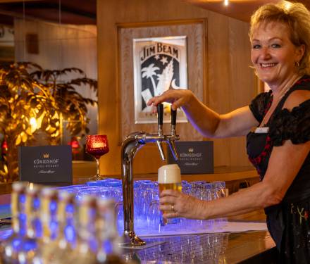 Genießen Sie dabei von unserer Barchefin Steffi einen der besonderen Cocktails des Königshofs, lassen Sie den Tag in Gesellschaft Revue passieren oder tanzen Sie ausgelassen in die Nacht. Hier erleben Sie das Nachtleben Oberstaufens von seiner schönsten Seite – ein Ort, der Ihren Urlaub mit Leichtigkeit und unvergesslichen Momenten abrundet.